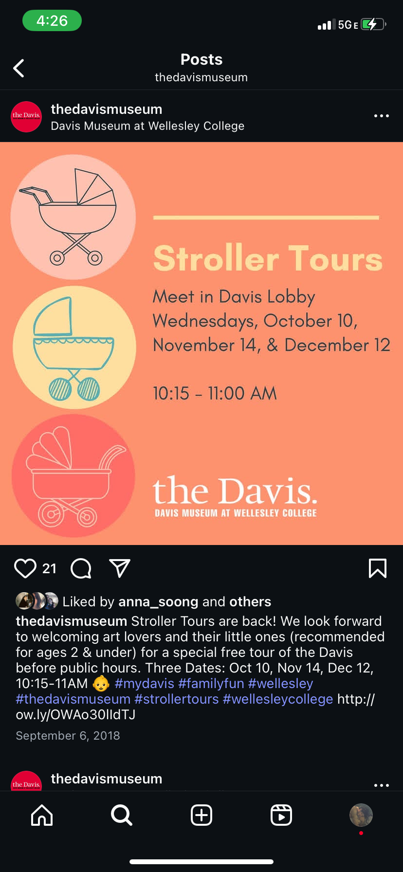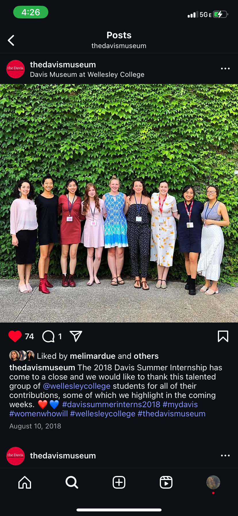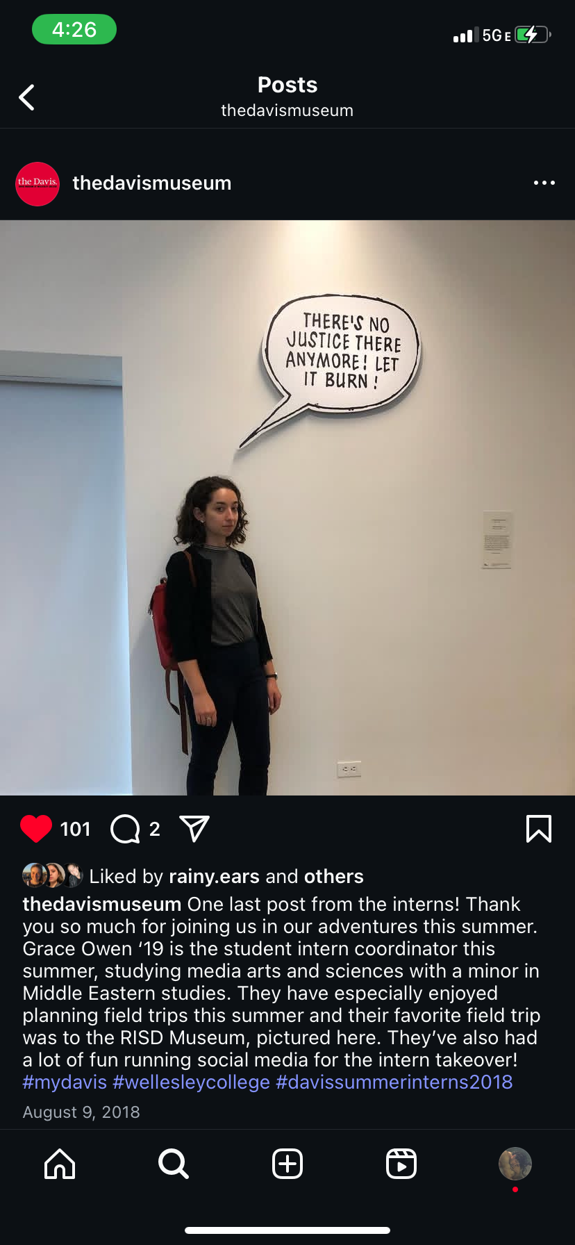 I've worked in the social media world since 2019 for a variety of clients and projects, including the Davis Museum at Wellesley College, the Office for Research and Innovation at Stony Brook University, and fundraising campaigns for feature films.